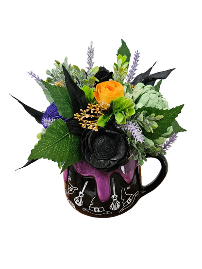 Add a pop of color with a Halloween arrangement set in these cute themed mugs.